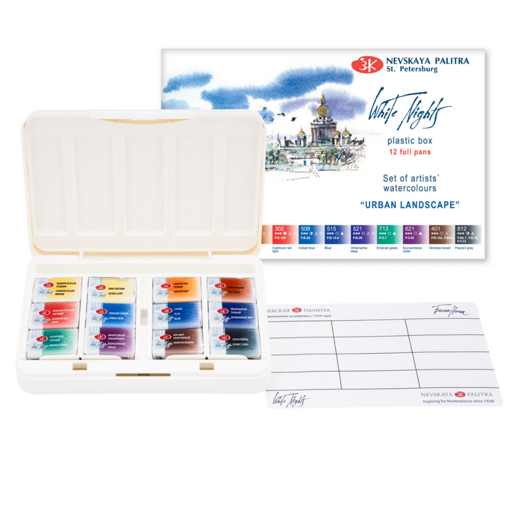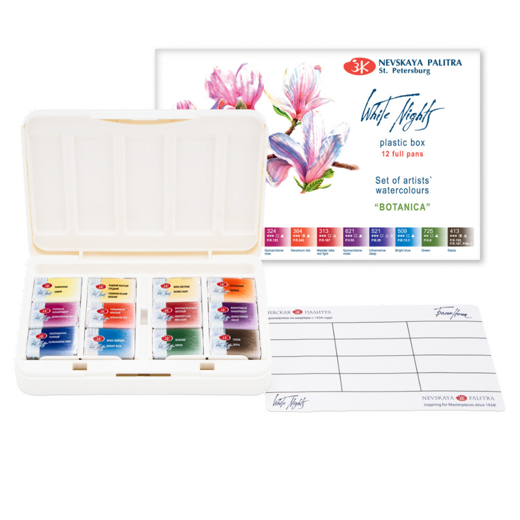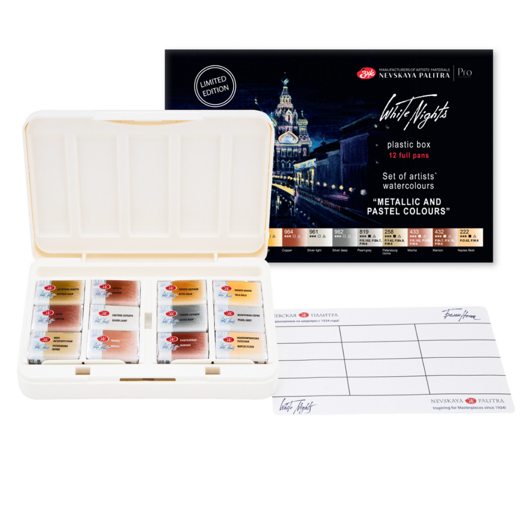White Nights 由俄羅斯 Nevskaya Palitra 工廠製作,擁有超過 85 年水彩製作經驗,使用高品質天然阿拉伯膠與細緻顏料研磨,提供卓越的色彩飽和度與持久性。無論是植物畫、城市景觀還是柔和金屬與粉彩效果,White Nights 都能滿足專業藝術創作者的需求。