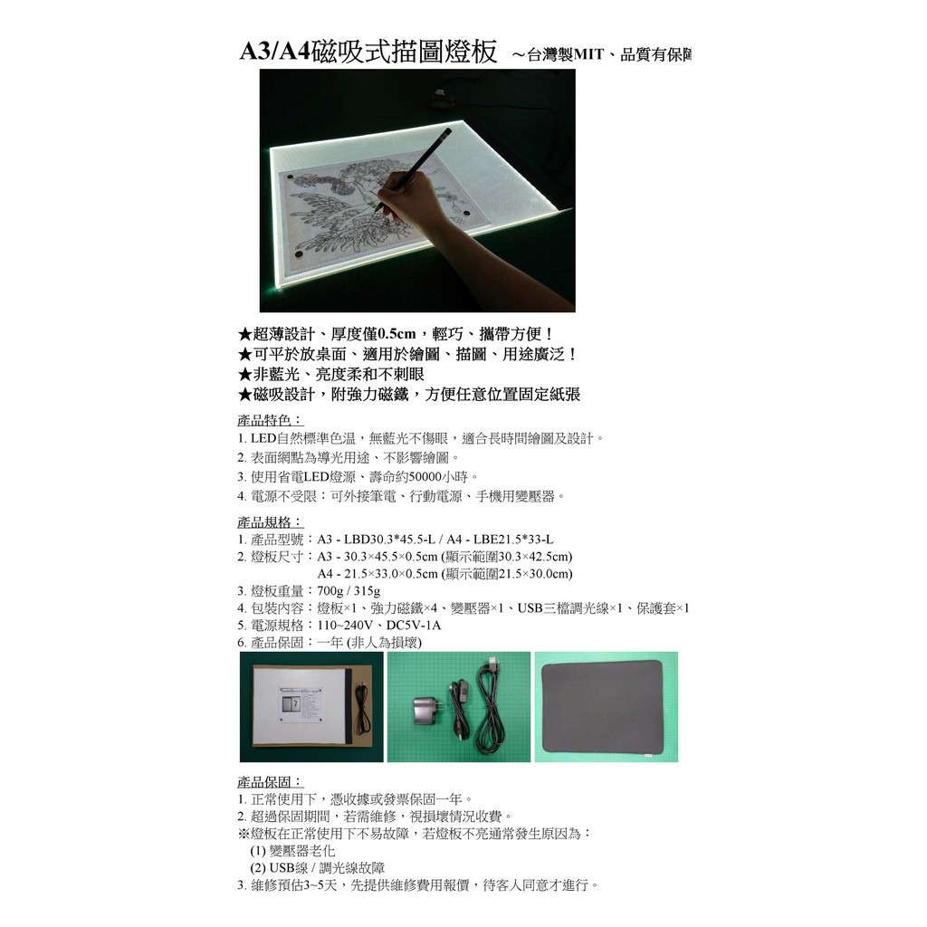 台灣製 磁吸式調光型描圖板 USB-LED描圖板 / 光桌 / 透寫台 / 超薄燈箱 全配