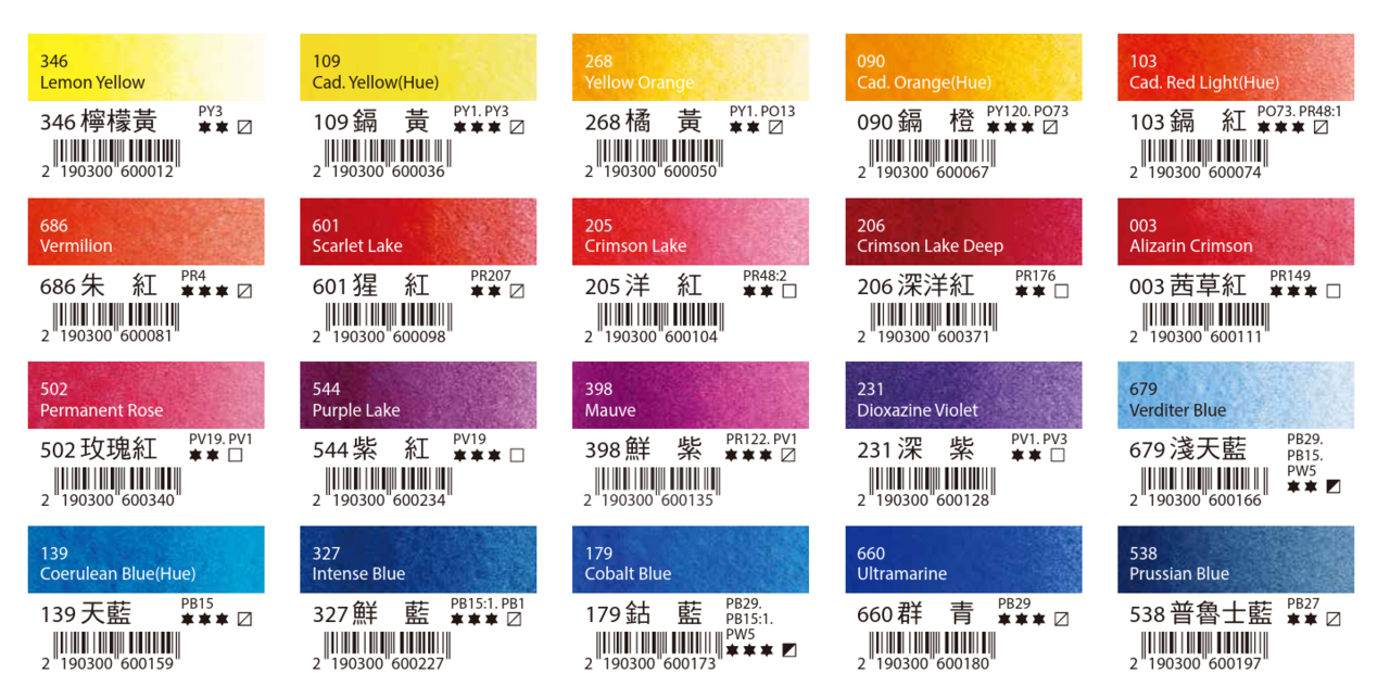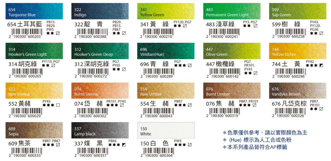 來自台灣新店研發製造,十餘年品質穩定,色彩飽和、透明水彩易混色。