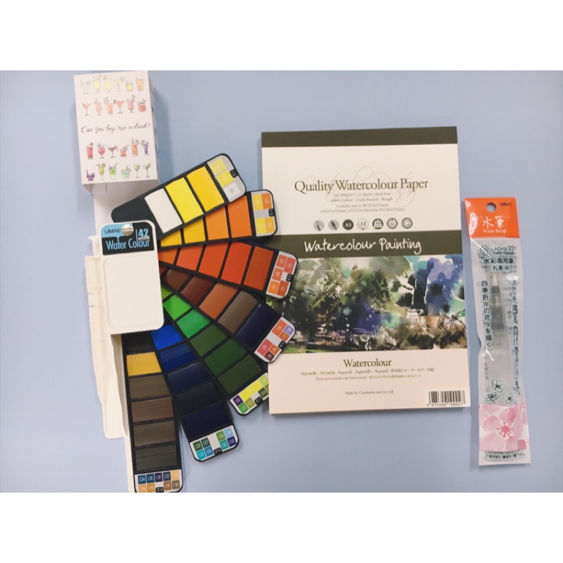 套組內容:42 色口袋塊狀水彩、義大利全棉水彩本(A5)、小瓢蟲水筆 1 支