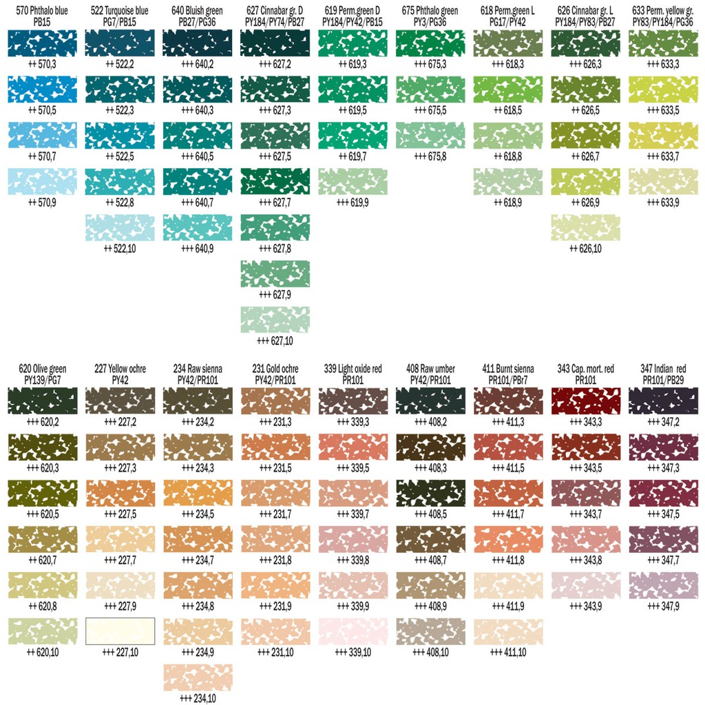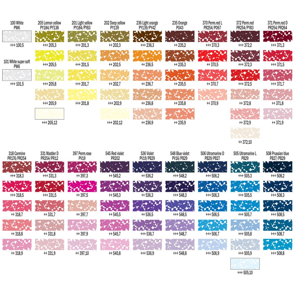色澤明亮、彩度高且延展性極佳。質地柔軟,輕輕推抹即可均勻散開,能表現出類似油畫般的豐富層次感。