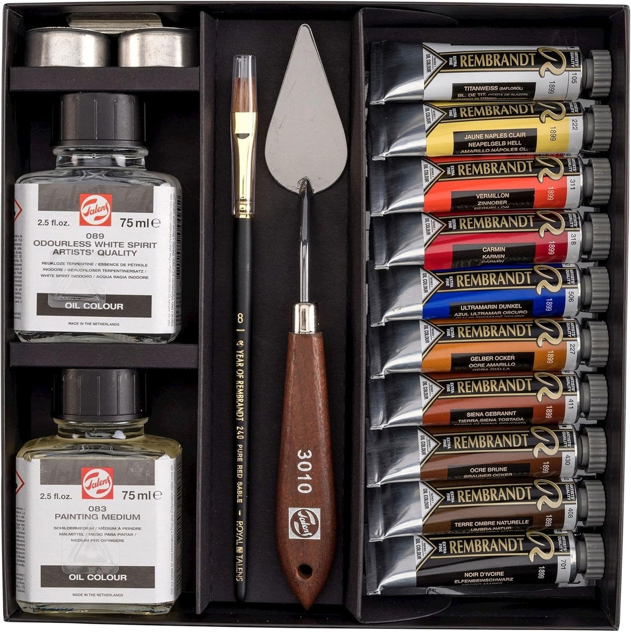 套裝內容:10 支油畫顏料(15 ml / 支)、1 支 No. 8 紅貂毛畫筆、1 支畫刀、1 個雙層金屬調色杯、Talens 089 松節油替代品 75ml、Talens 083 調色劑 75ml