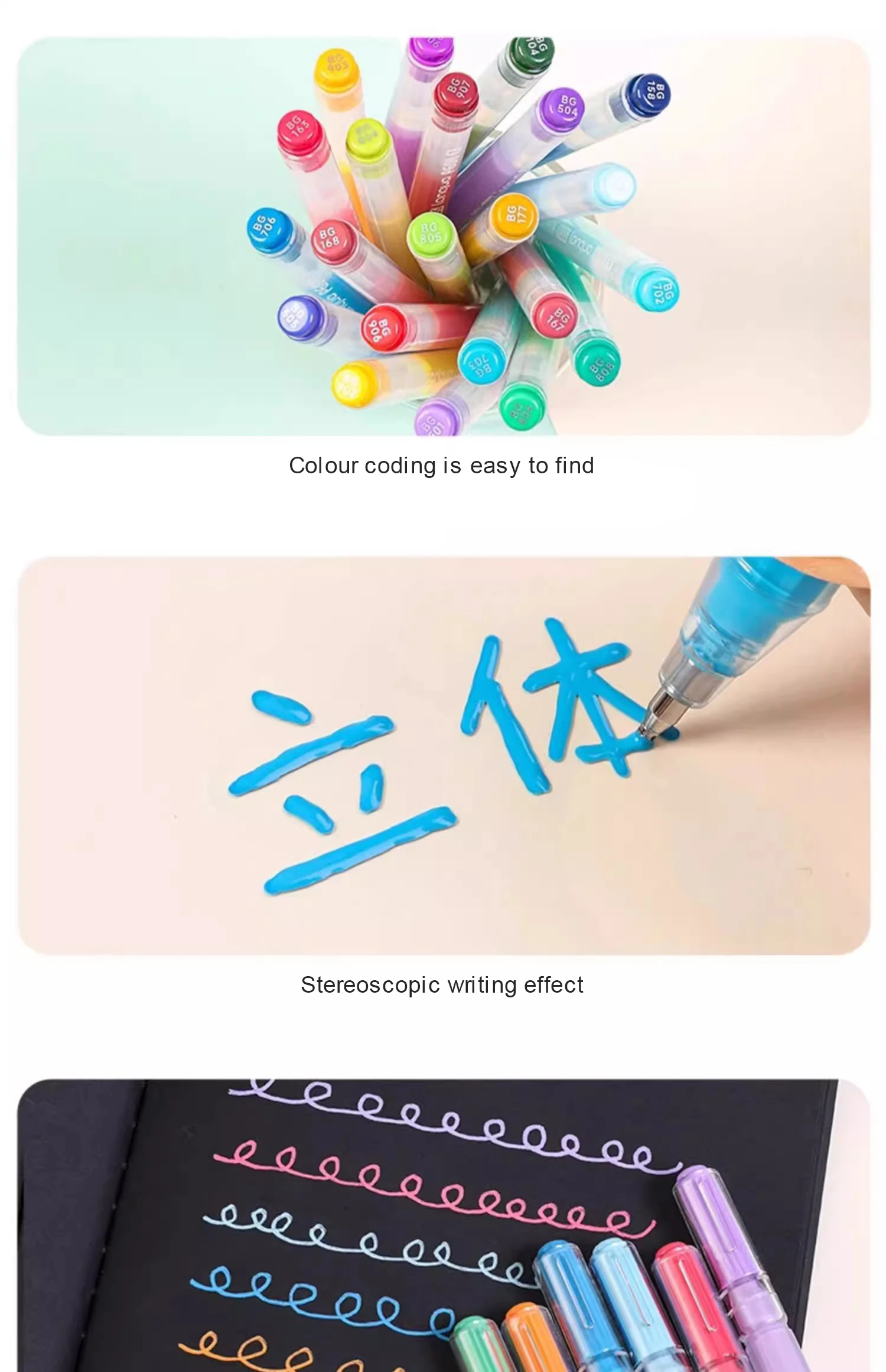 • 鮮豔壓克力墨水:筆跡濃郁、遮蓋力強,適合裝飾、插畫、手帳、塗鴉與DIY工藝。