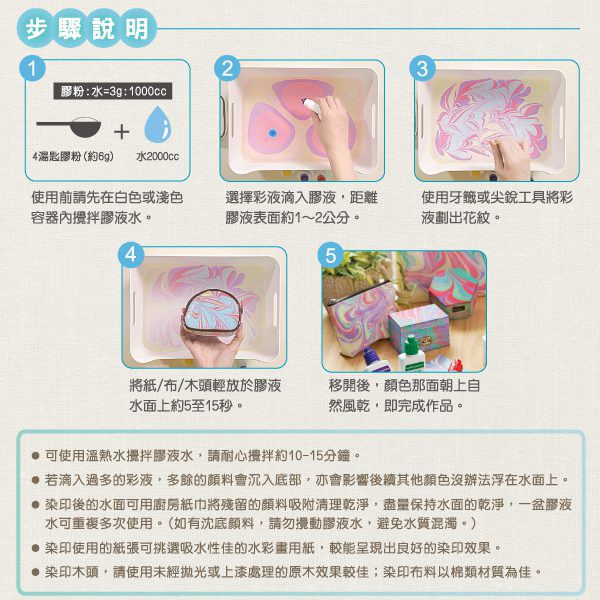 隨組附贈膠液調製粉,讓您輕鬆調配出最適合浮水畫創作的基底液。