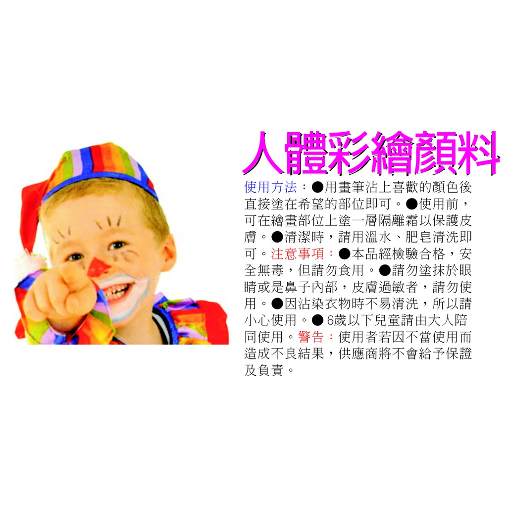 主要用途:人體彩繪、化妝舞會、節慶裝扮、創意彩妝。