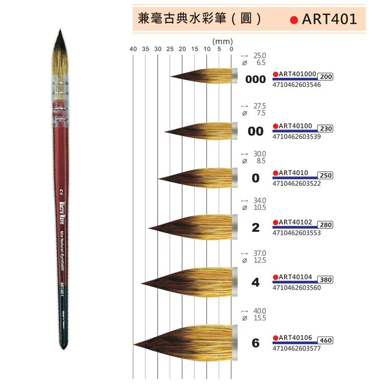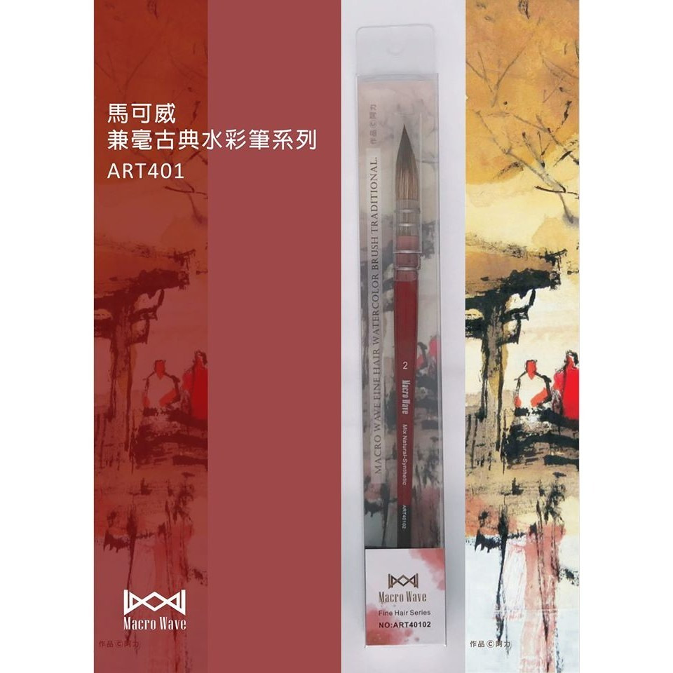 ART401 兼毫古典水彩筆結合傳統製筆工藝與創新設計,筆毛採用多種高級天然毛料與合成纖維混合製成,在保留天然動物毛優異含水性的同時,提升彈性與聚合性,能靈活應用於各種水性顏料技法,兼具實用性與收藏價值。