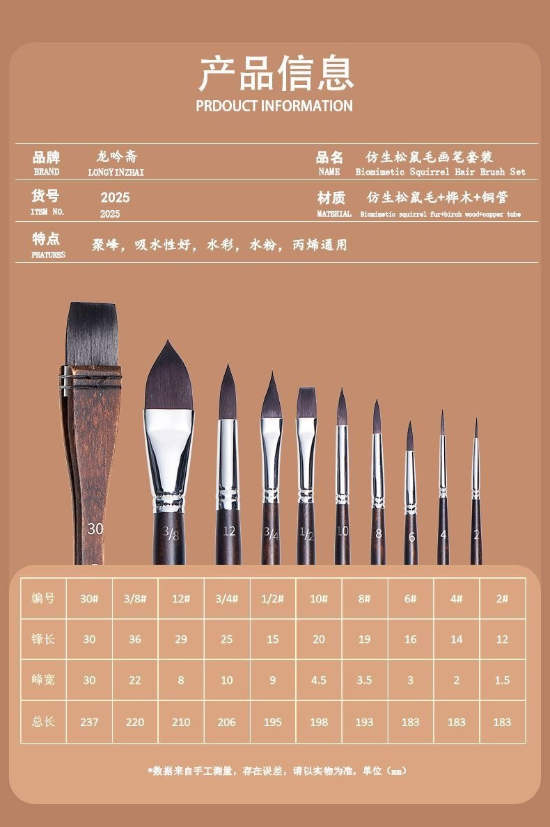龍吟齋•2025仿生松鼠毛10支水彩水粉丙烯通用套裝